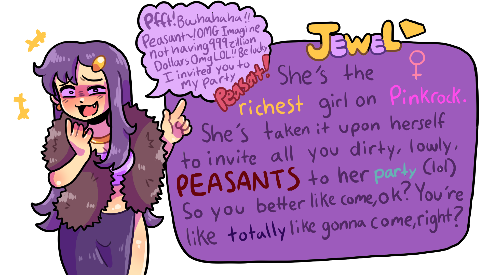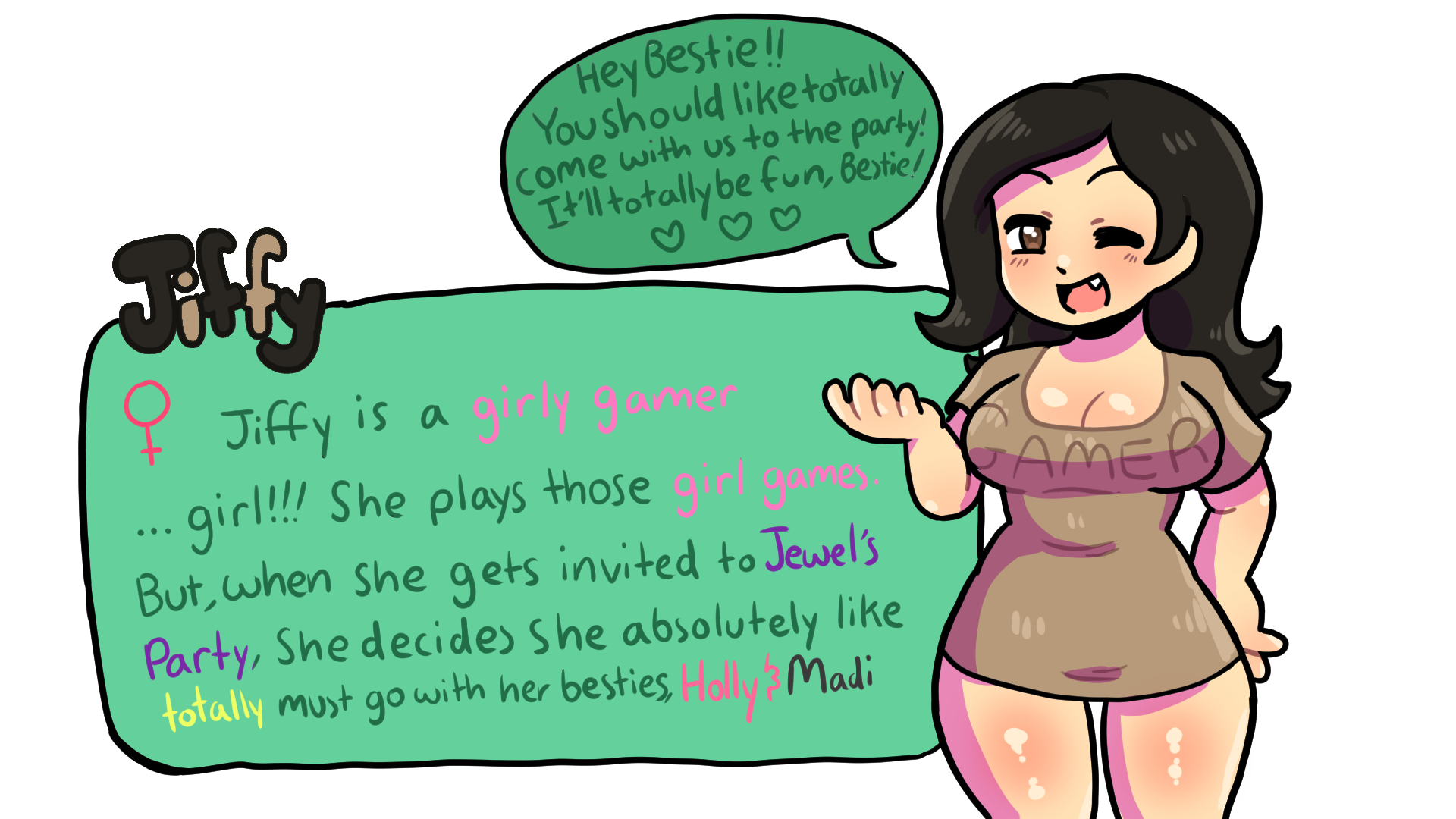 When Holly gets an invitation to Jewel's party, her and her friends Jiffy and Madi must figure out how to get there! It doesn't help that Jewel's party is in the middle of space. Can you help Holly, Jiffy, and Madi make it to Jewel's party?